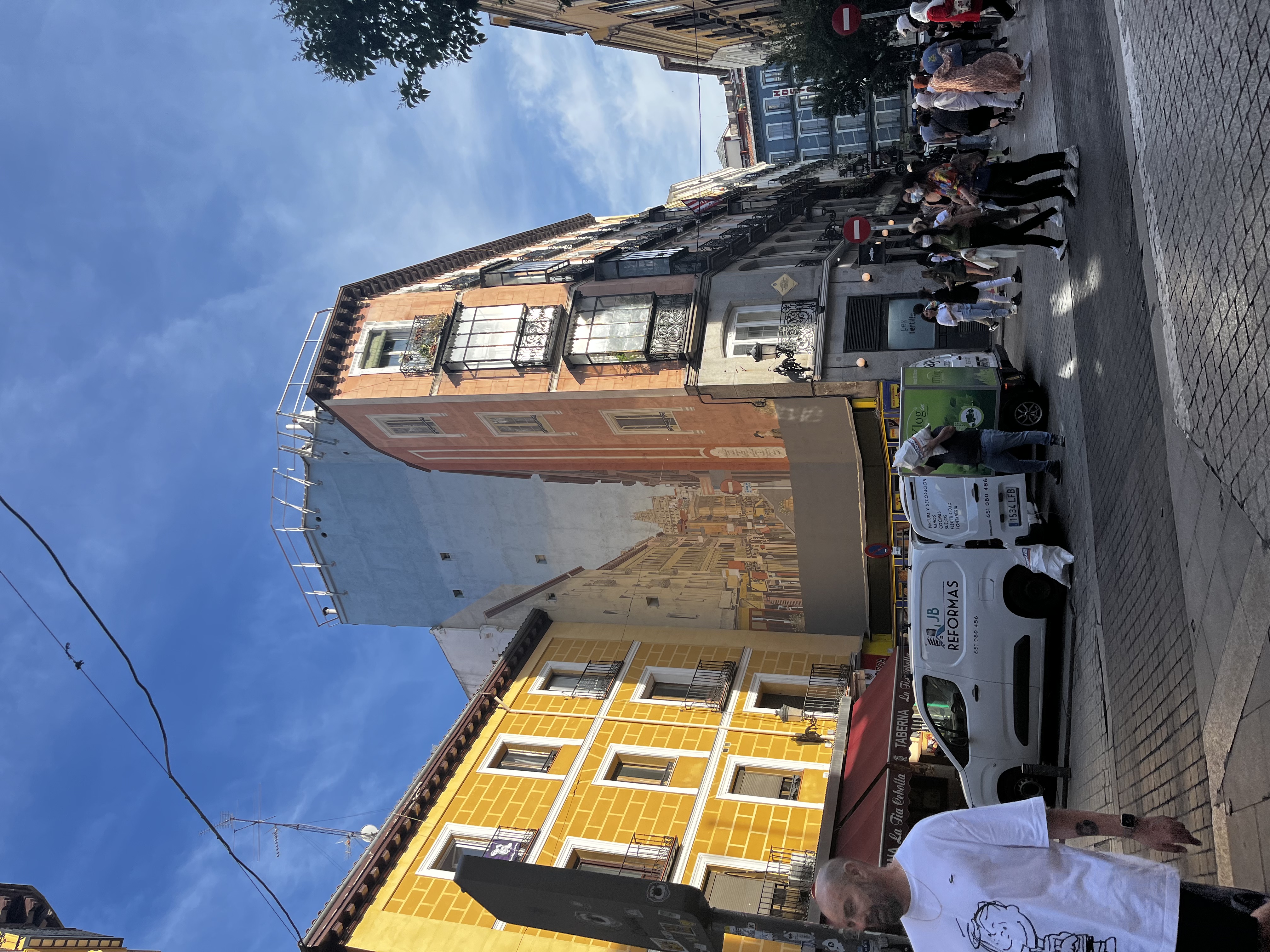 We started the day with a guided bus tour around Madrid. The city is the capital of the Country, so we mostly saw government buildings placed tightly into the space. We stopped at Las Ventas, the biggest Bull Fighting ring, we learned the rules of the game but was in no way eager to play! Our next stop was the Royal Palace, we walked the grounds outside, and saw the change of the Traditional Spanish Gaurds outside the front gates. We had free time after this, my small group parted ways with the rest of the tour and went shopping, buying crystals and having lunch at a Tapas market. It’s basically like a bunch of food trucks in a building, we shared a bunch of little dishes and got Mojitos! We were walking to the subway station to get back to the hotel when we stumbled upon a couple Catherdrals. It was very beautiful architecture. We met up with the rest of the group, our CCS trip leader took us to Casa Antillion, an art collective based out of Madrid that houses young and upcoming artists in the area.