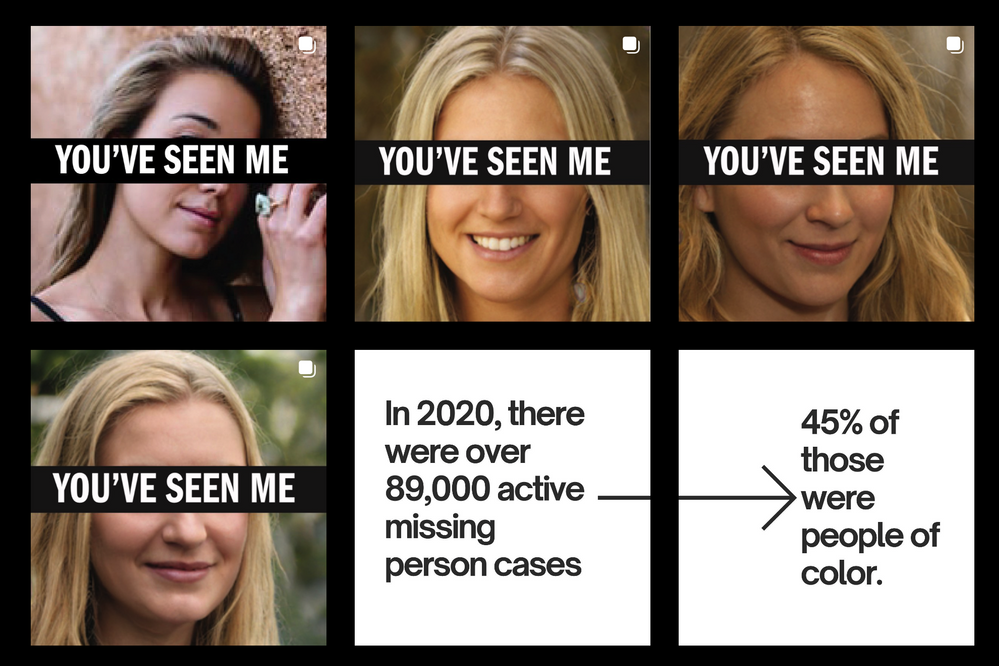 The objective of this project was for designers to create an interactive experience with one selected article. Can you help find me since the media won’t?This was based on the phenomenon of “Missing White Woman Syndrome” – where the media gravitates to solve missing white women cases 40% more often than missing Women of Color. You Have Not Seen Me utilized the space by having the user walk around the entire floor, scanning QR codes of white women that then takes them to an Instagram page highlighting cases of unsolved missing person cases of women/girls of color.